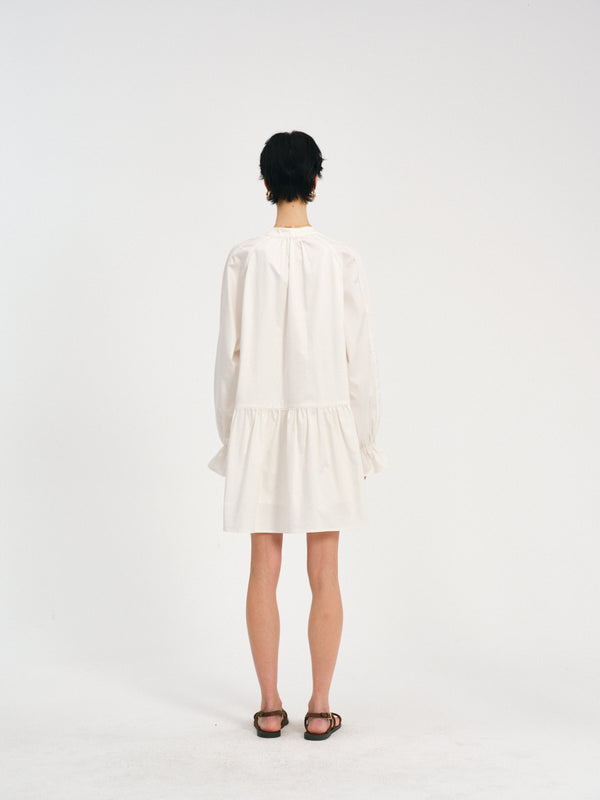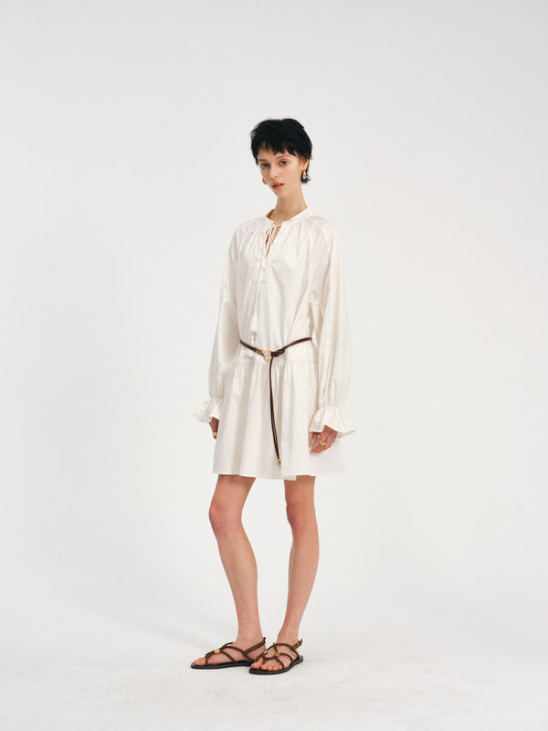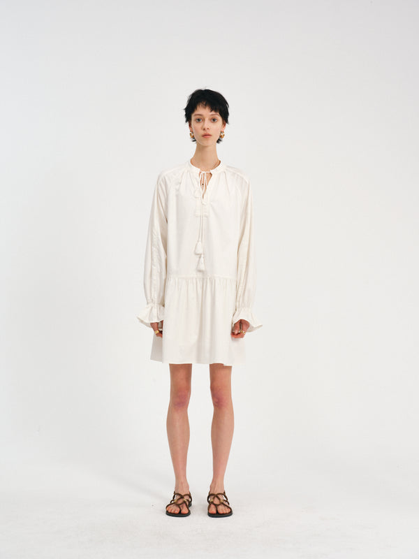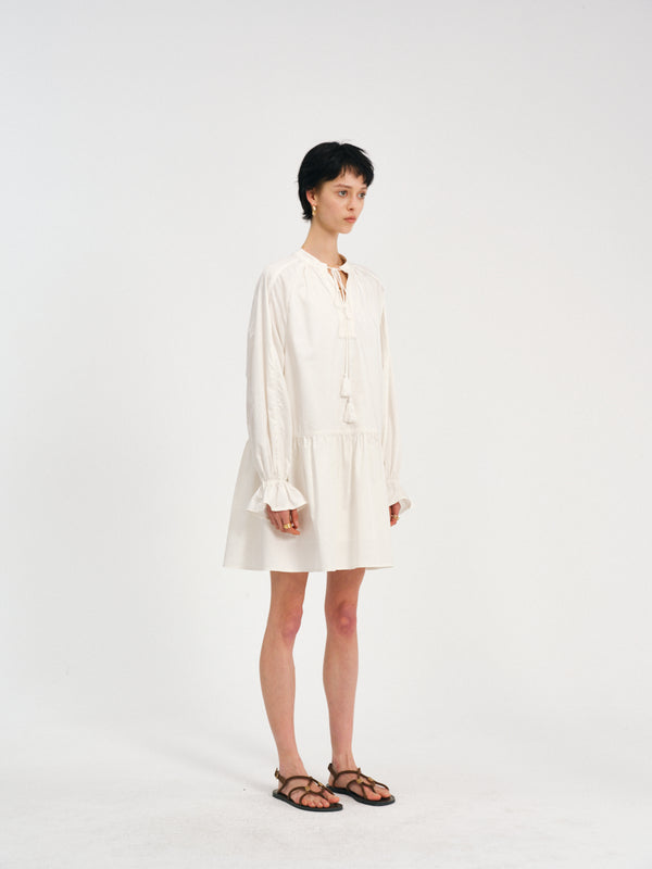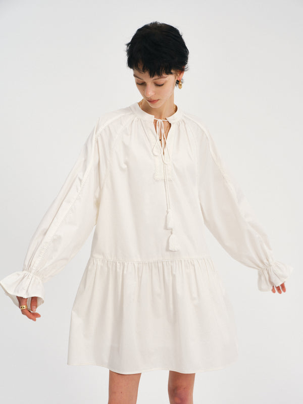 A tasseled V-neck dress with raglan volume—lace at the edges, pleats in motion.