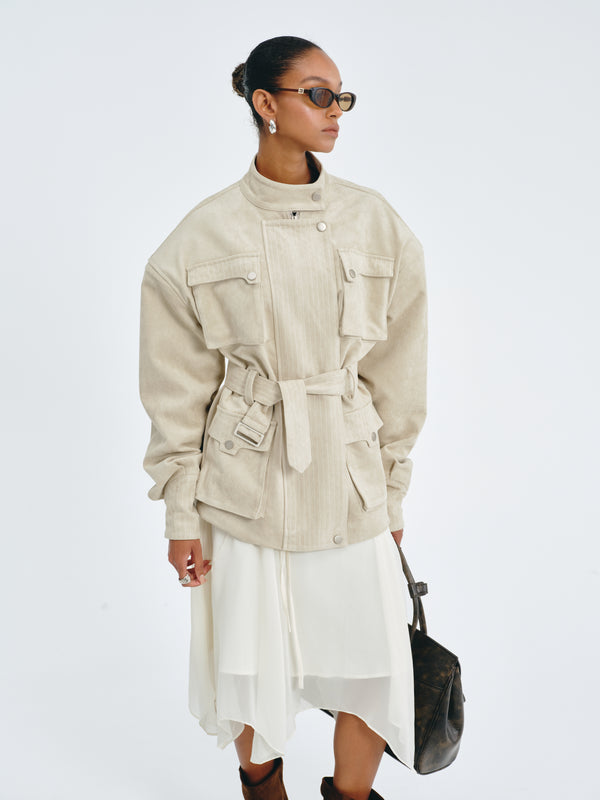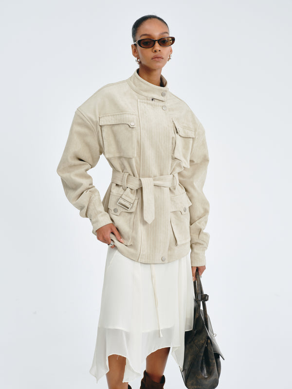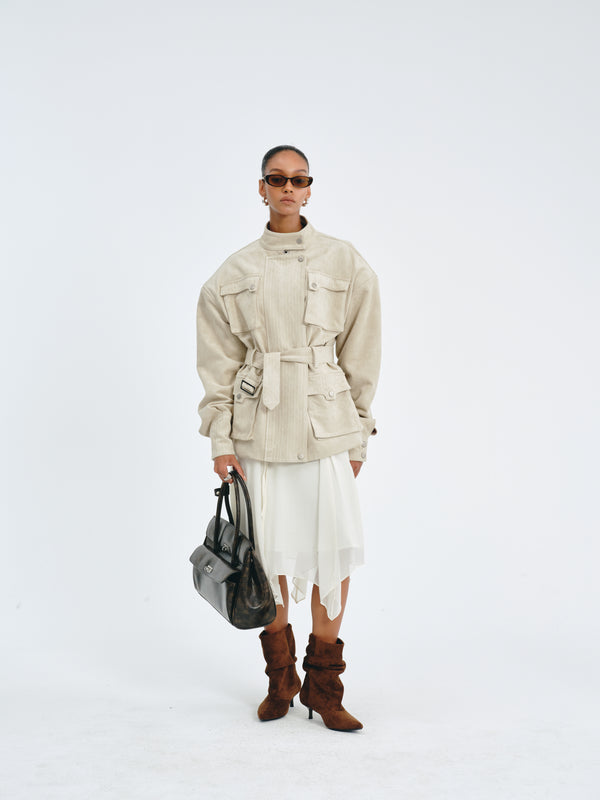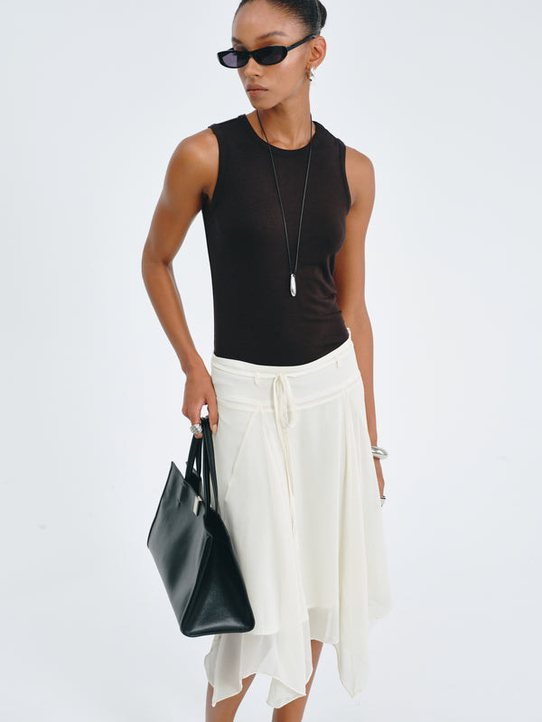 Flowing chiffon skirt with an asymmetric hemline and adjustable waist tie.
