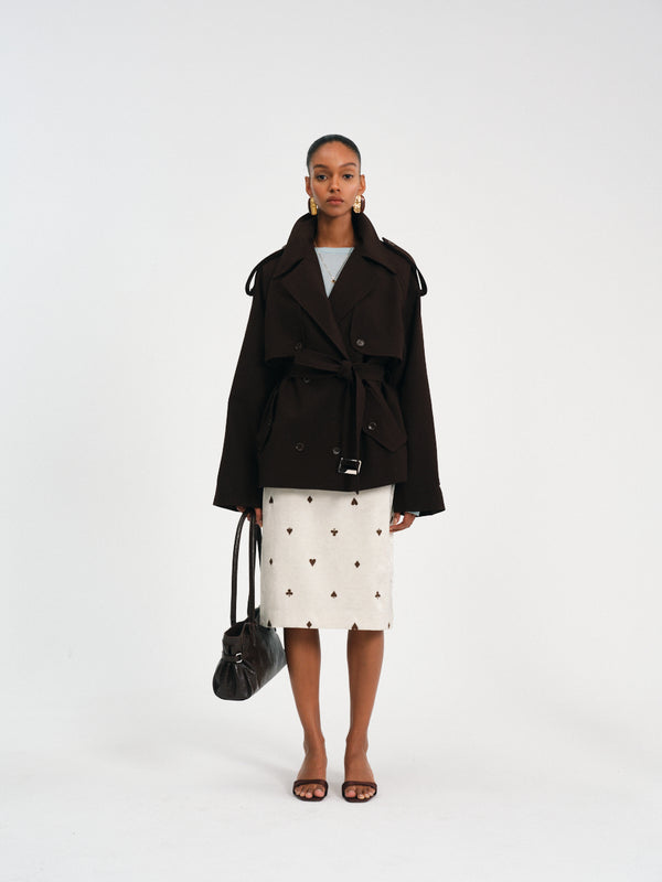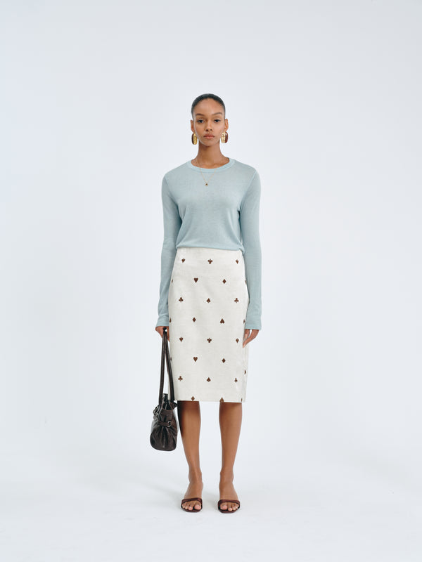 High-waisted A-line skirt with jacquard fabric and embroidered poker detail for a touch of playful luxury.