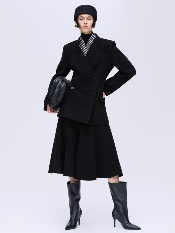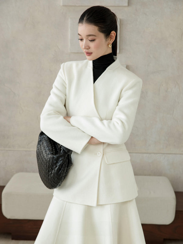 Two-piece wool set featuring a V-neck jacket and matching skirt.