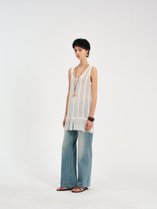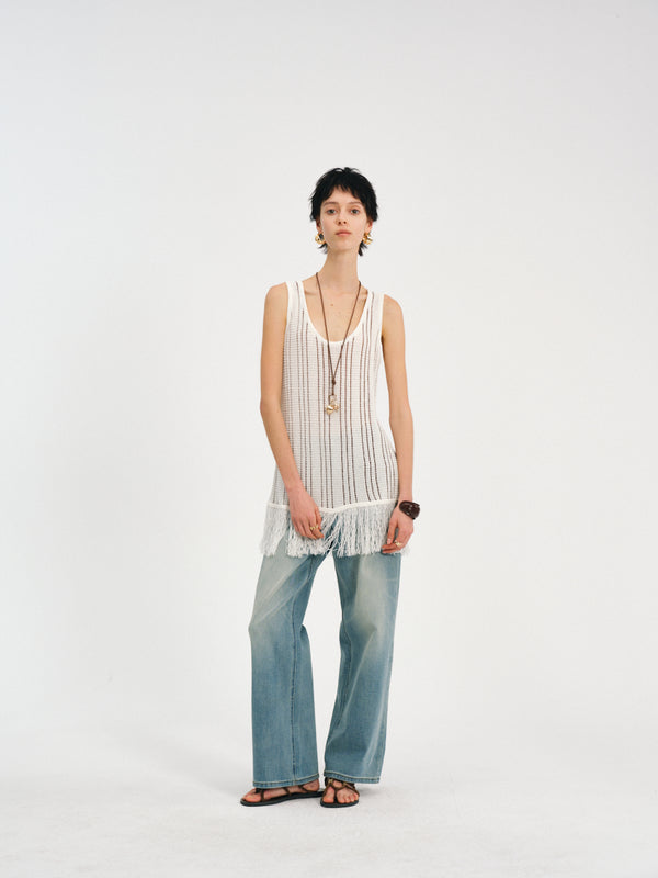 A striped open-knit tank with a fringe hem—light on the body, graphic in motion.