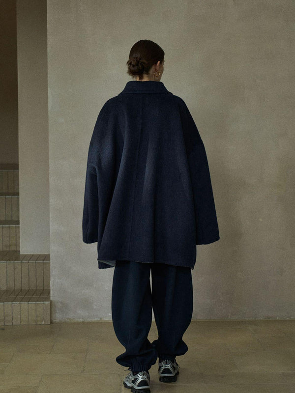 Pure wool overcoat with double-faced construction and quiet, refined warmth.