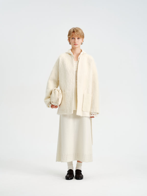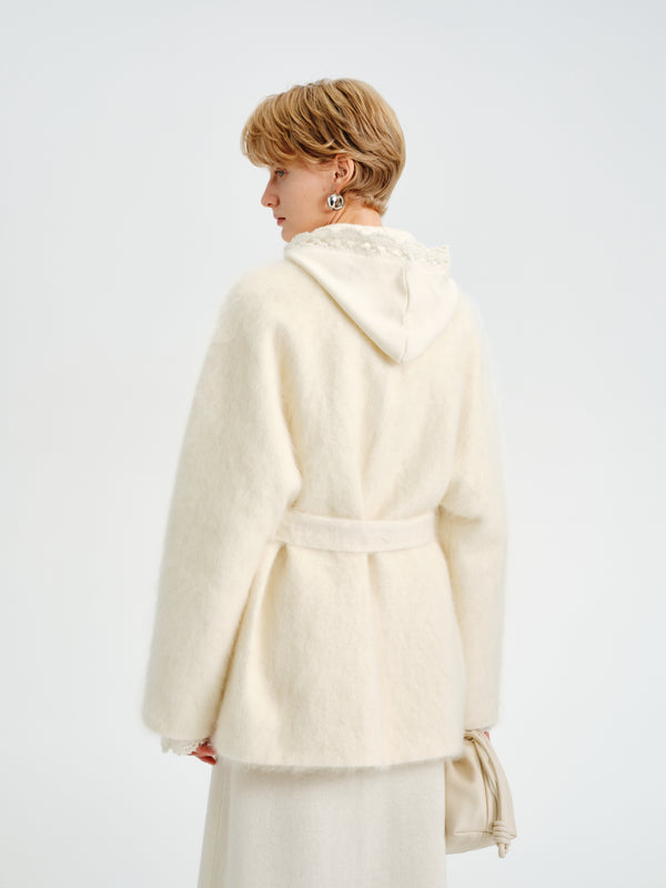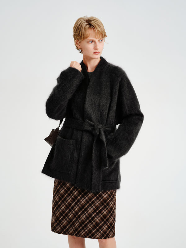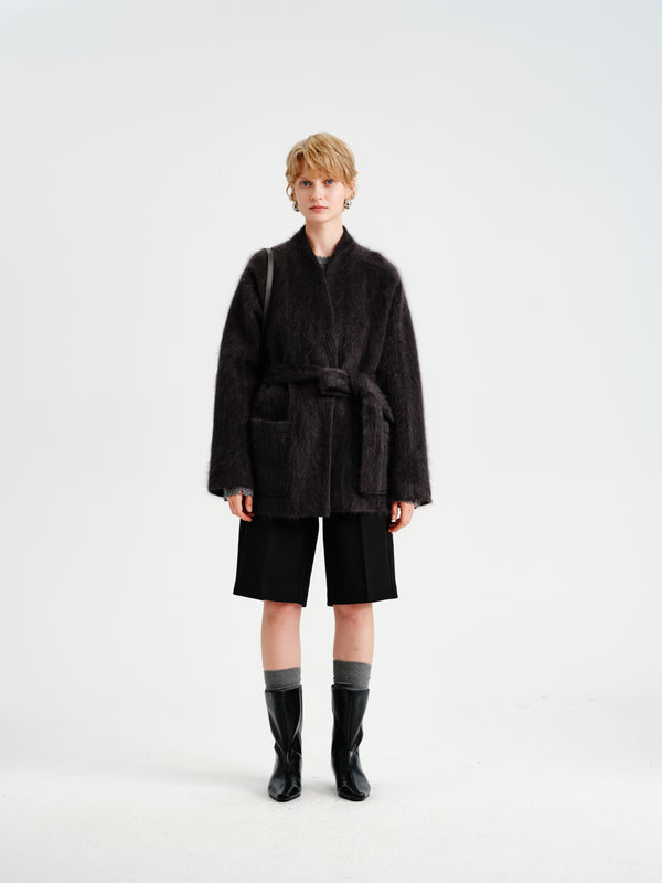 Soft brushed cashmere-wool robe coat with a relaxed, belted silhouette.