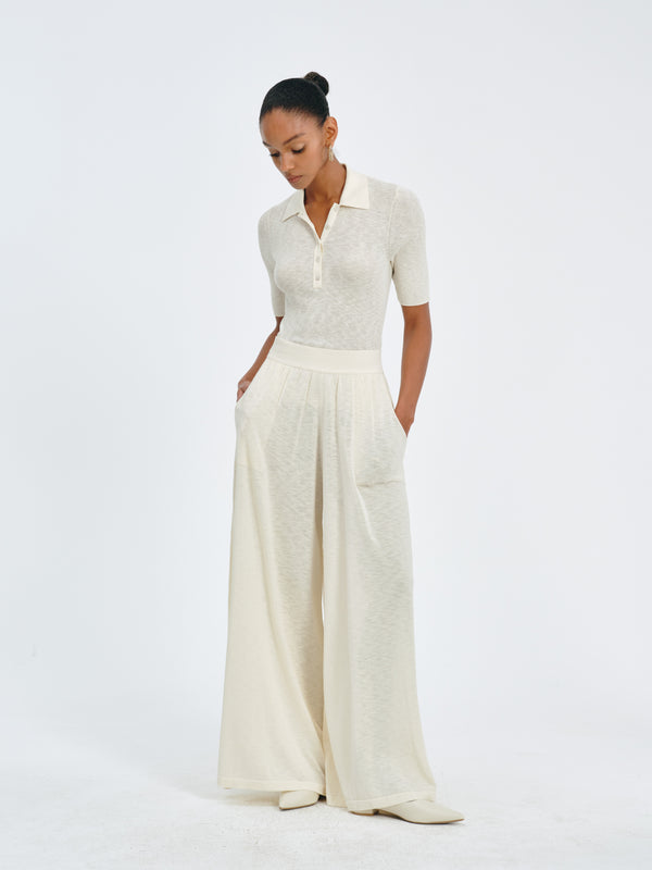 Elastic-waist wide-leg trousers with breathable cotton-linen knit fabric and front pockets for a relaxed, stylish fit.