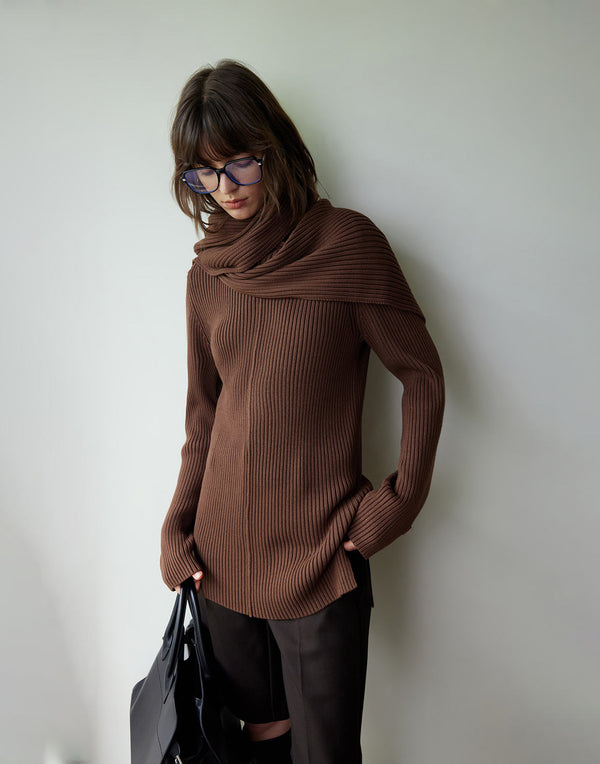Ensemble pull et écharpe en maille côtelée—doux, confortable et parfaitement superposé.