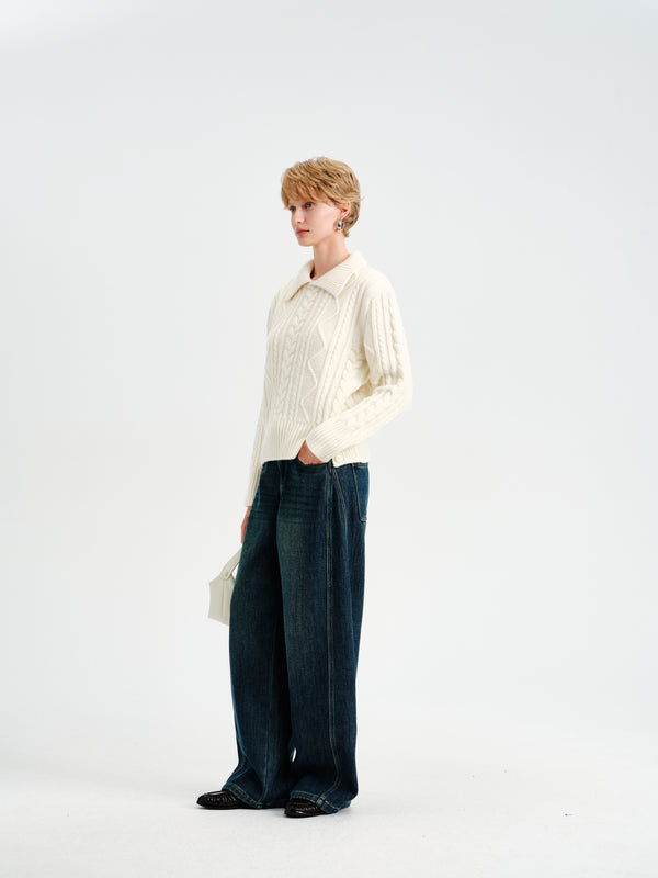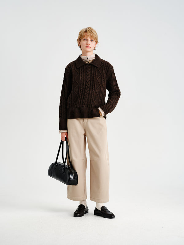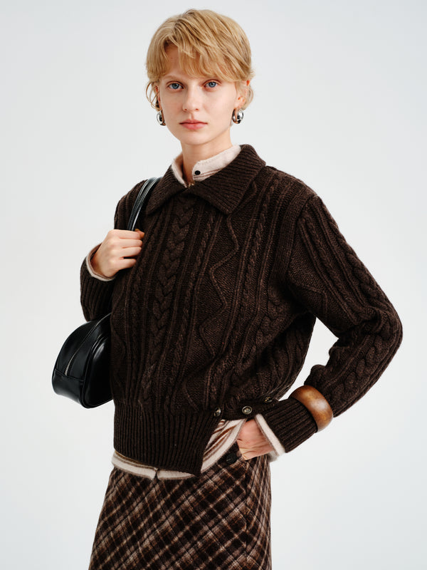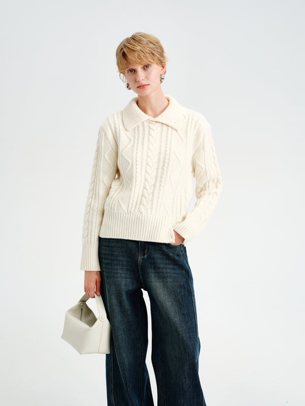 Raccoon-wool blend cable sweater with a relaxed, chunky silhouette.