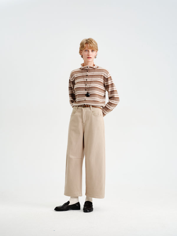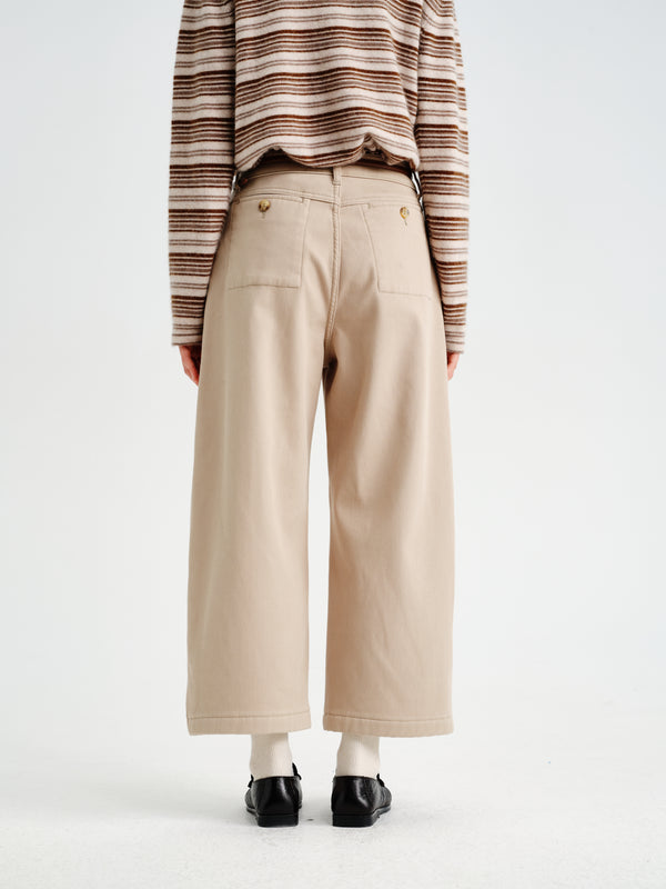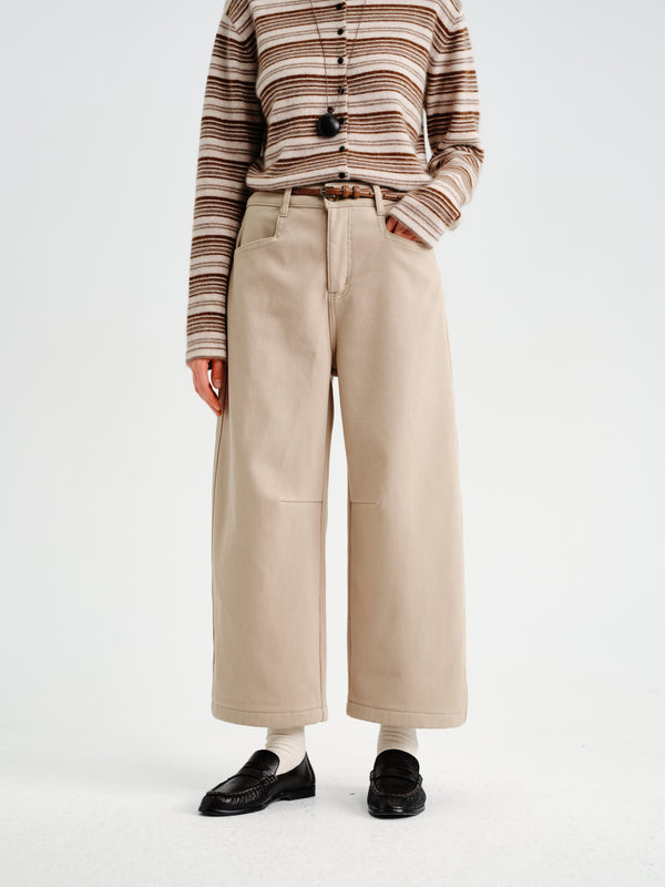Softly structured cocoon jeans with a fleece-lined interior for quiet winter warmth.