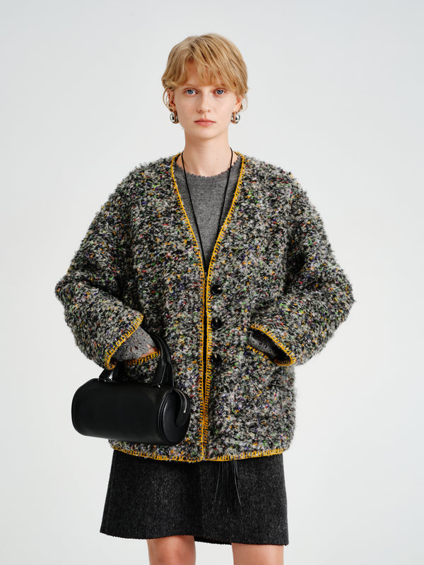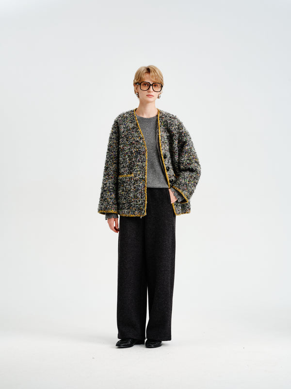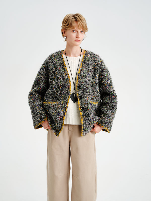 Textured wool tweed down jacket with contrast crochet edging and a relaxed, boxy cut.