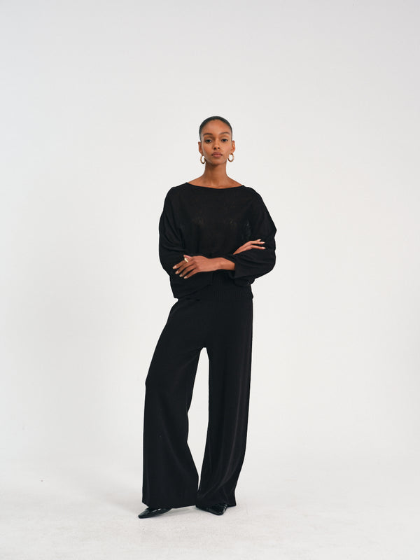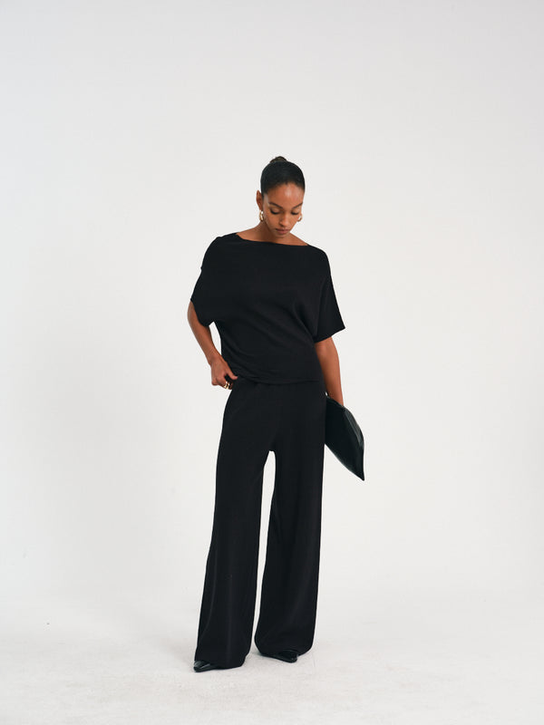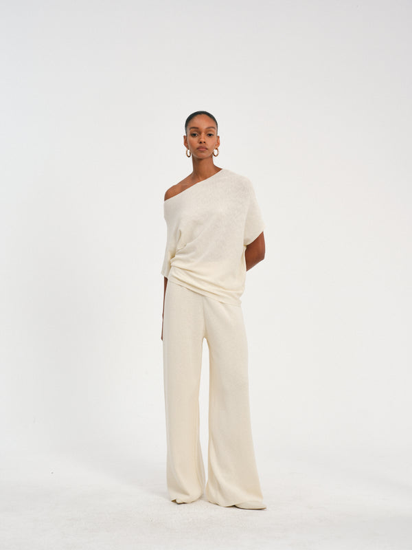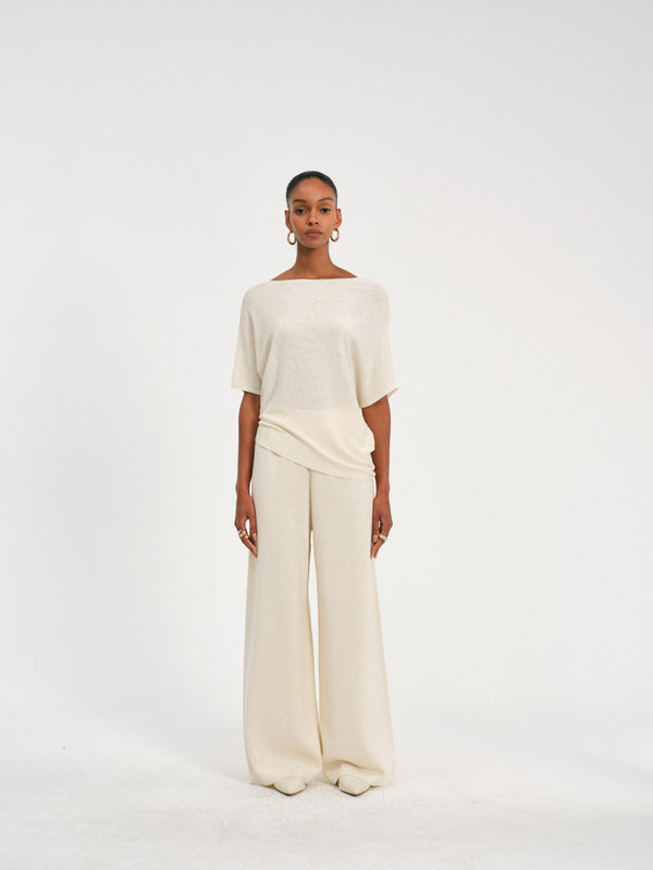 High-waisted pleated waist wide-leg pants in a cotton-linen blend, offering a relaxed yet polished look.