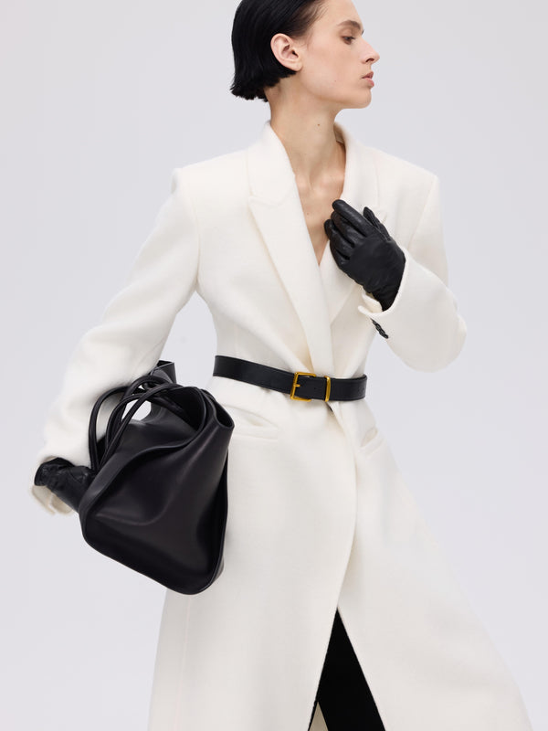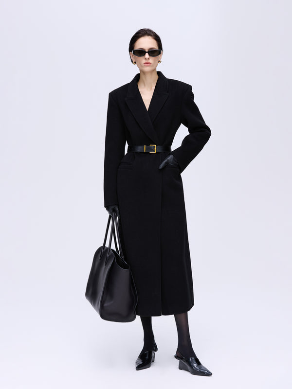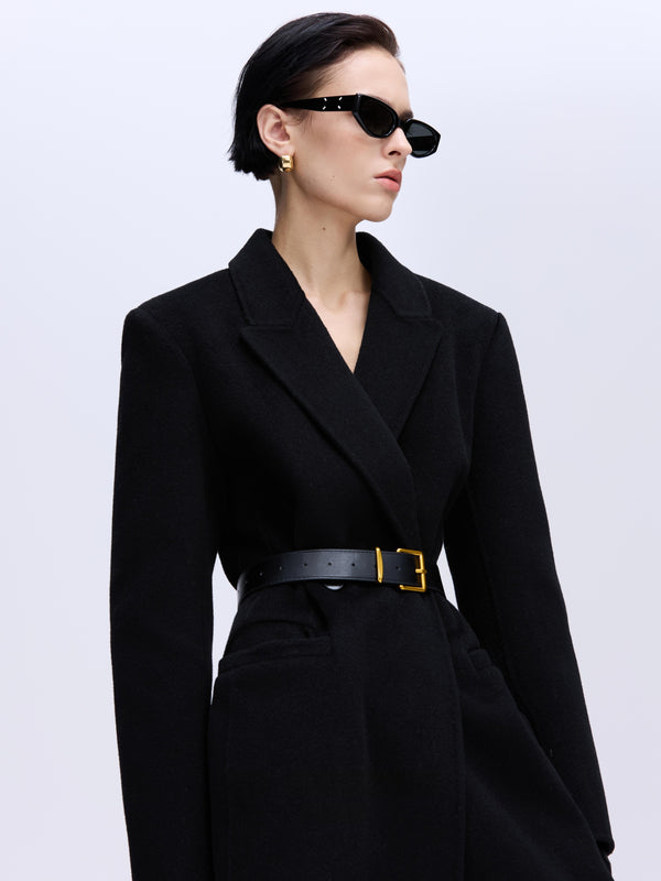 Structured wool–alpaca coat with tailored lapels and belt detail.
