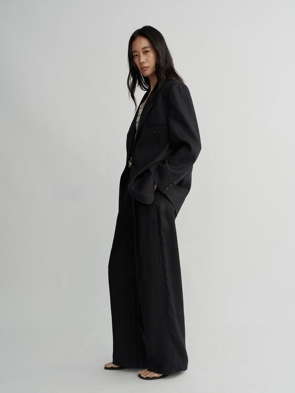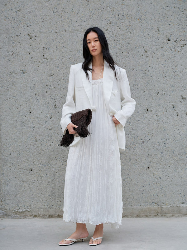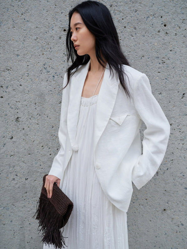 Clean shoulder, long line—linen kept crisp.