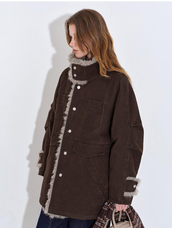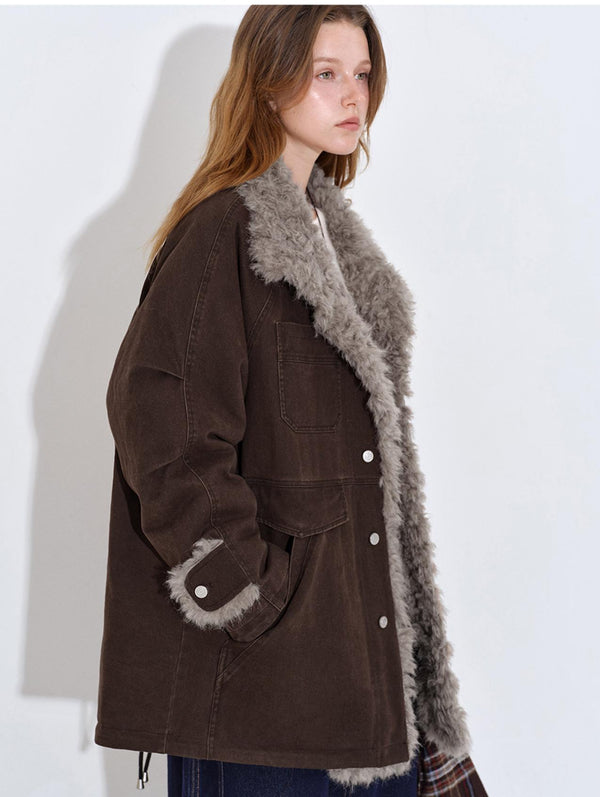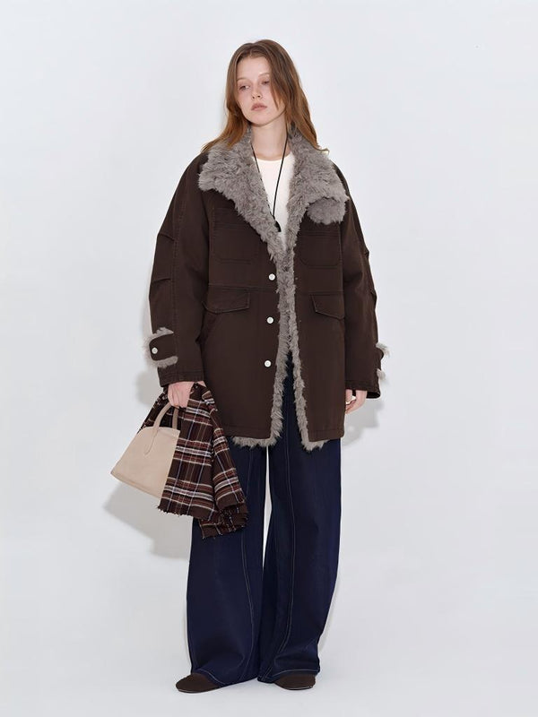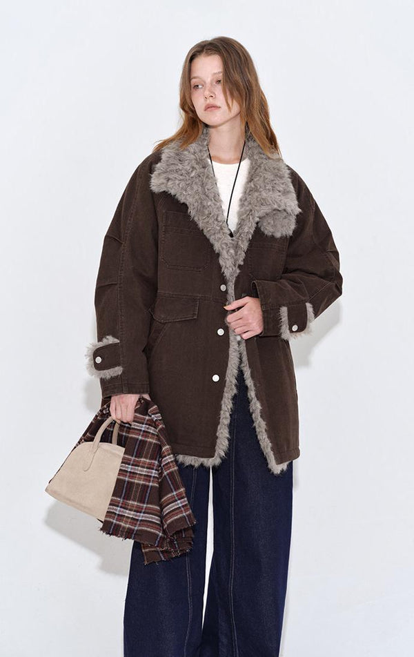 A washed-canvas down parka with tonal fur trim—utility lines, softened warmth.