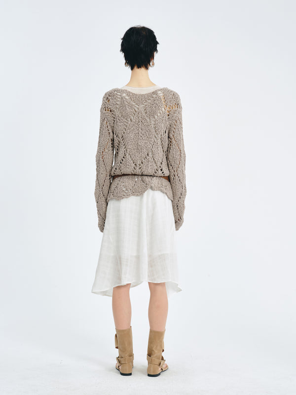 A flowing asymmetrical skirt with subtle jacquard detail—soft texture, sculpted movement.