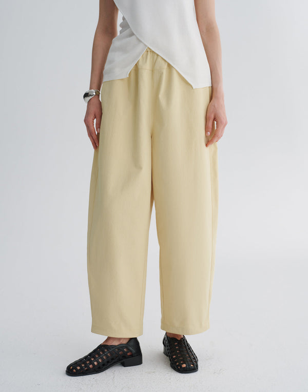 Pantaloni moderni a bozzolo con linee affusolate e struttura confortevole.