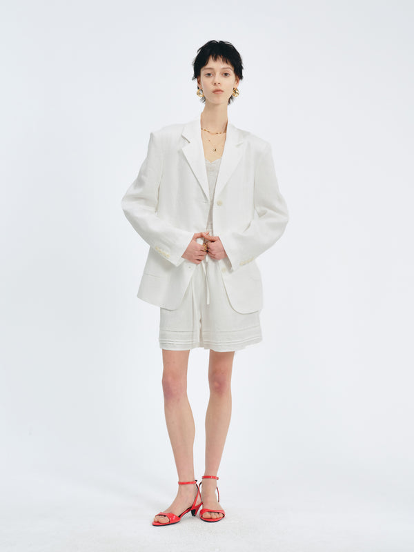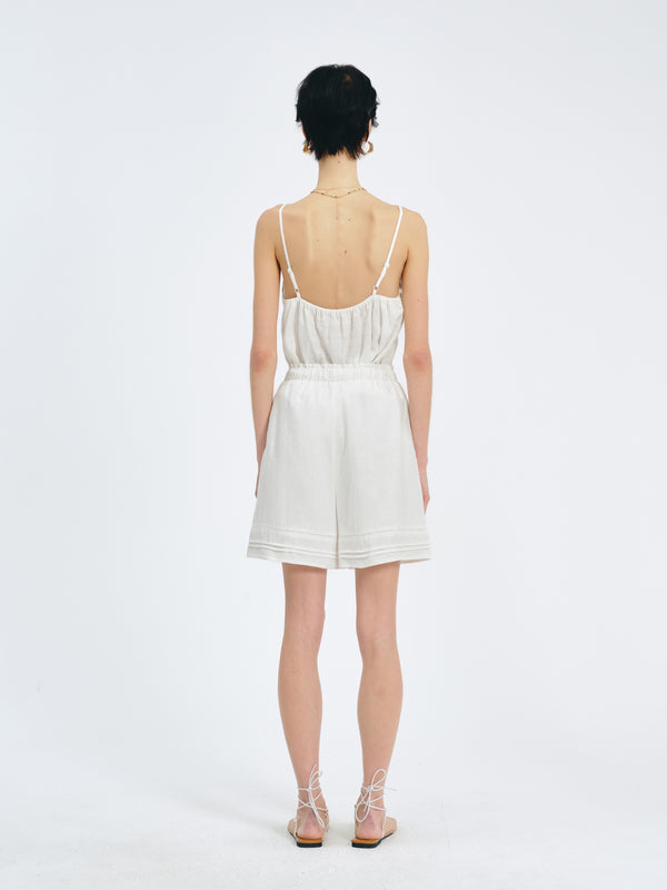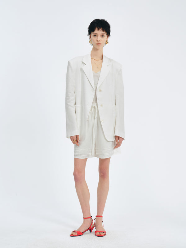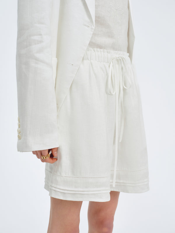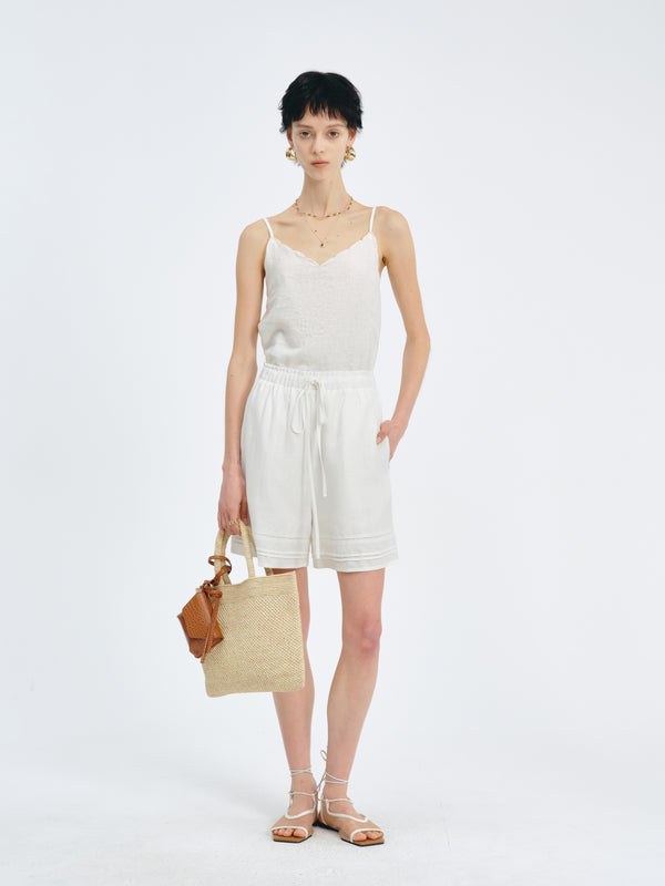 Hemp shorts with a drawstring waist—quiet air, clean proportion.