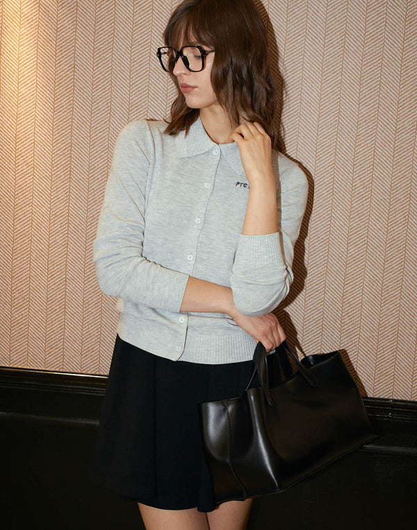 ウール混カーディガン、構築的なポロカラーで仕上げた新しい快適さと上品さ。