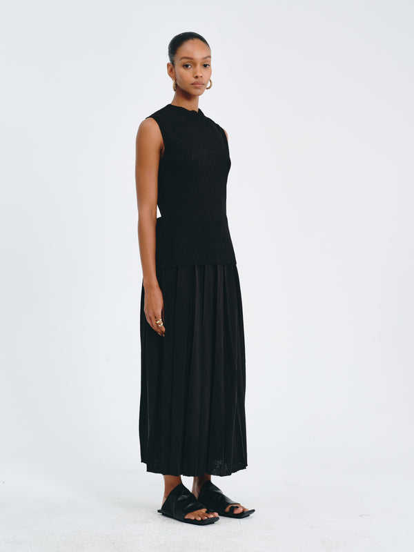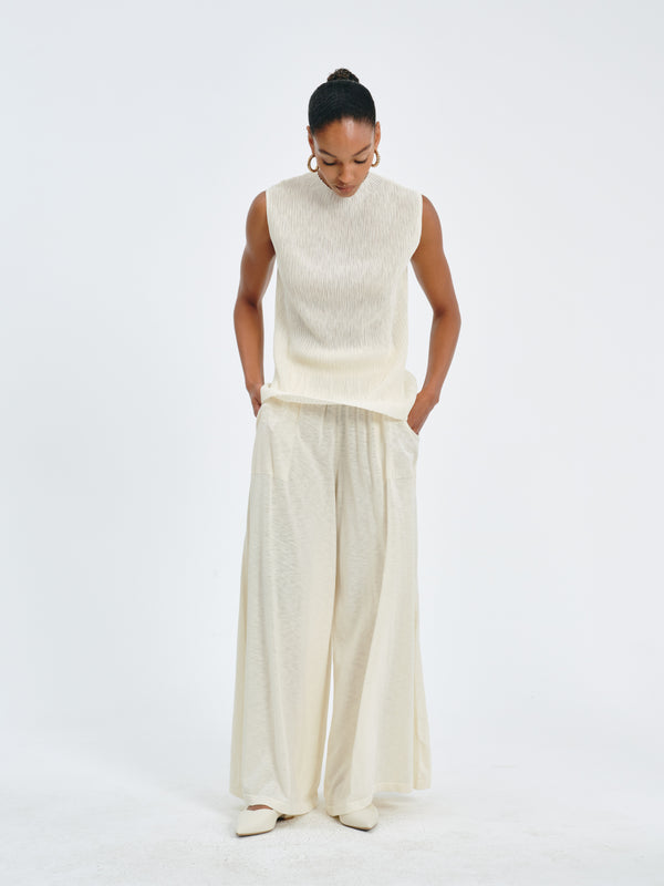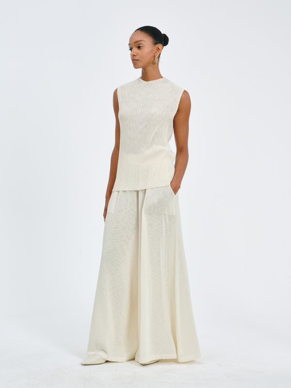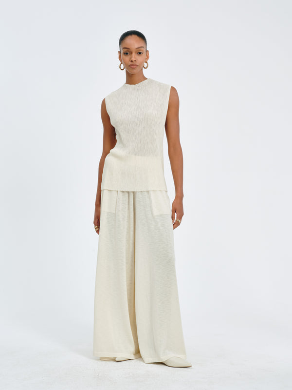 Pleated knit tank top with a round neckline and sleeveless design, crafted from a breathable cotton-linen blend