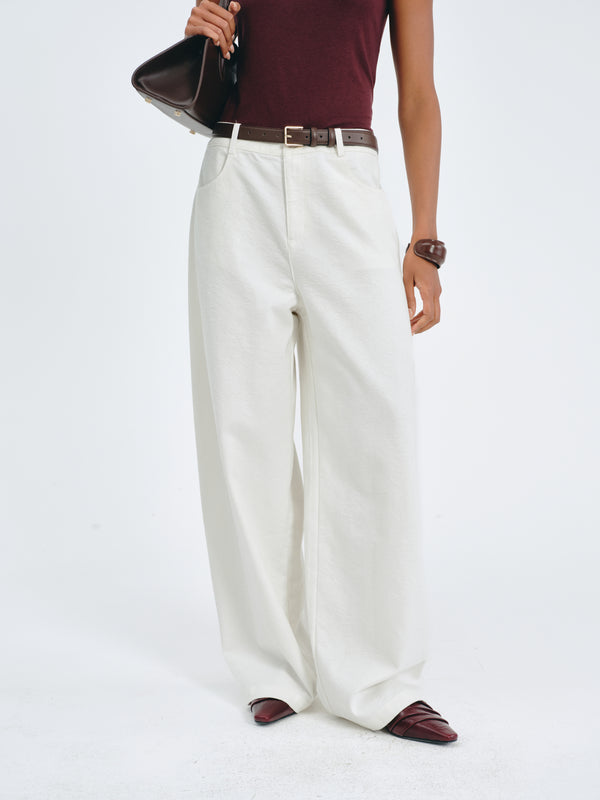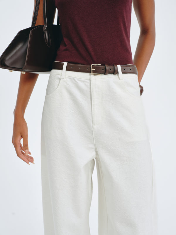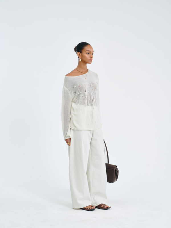 Wide-leg jeans with crescent-shaped pockets and a breathable knit texture.