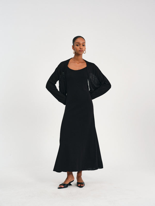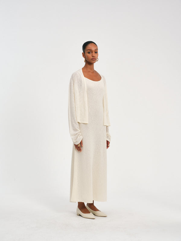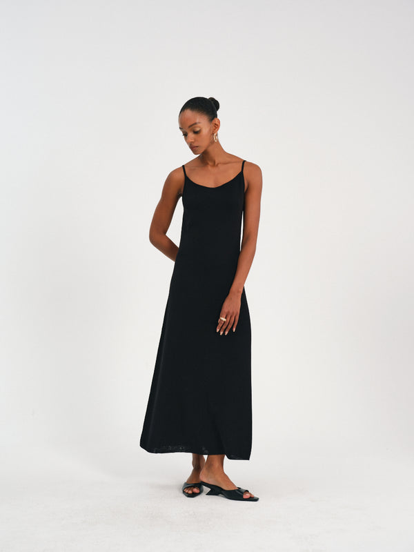 Breathable cotton-linen maxi dress with adjustable straps and a high waist for a relaxed, effortless fit.