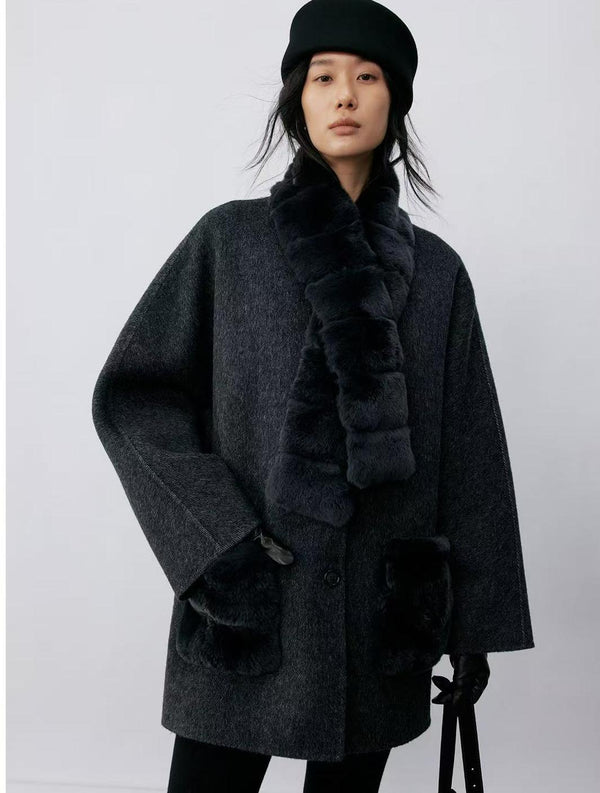 A plush, panelled rex-rabbit scarf designed for quiet warmth—minimal, sculptural, and easy to style.