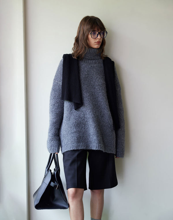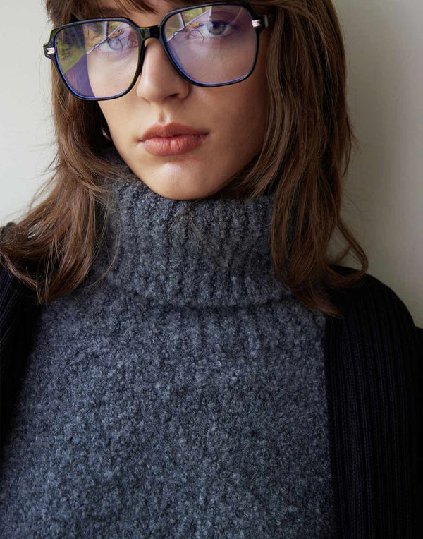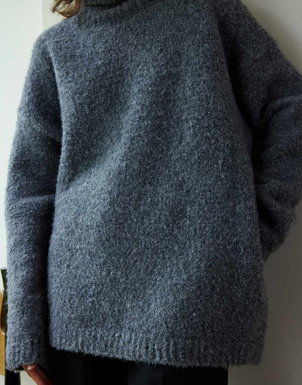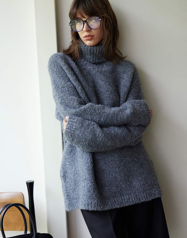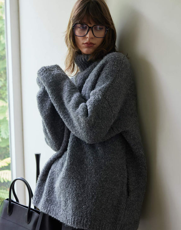 Plush boucle texture meets cozy warmth—an elevated turtleneck with subtle ease.