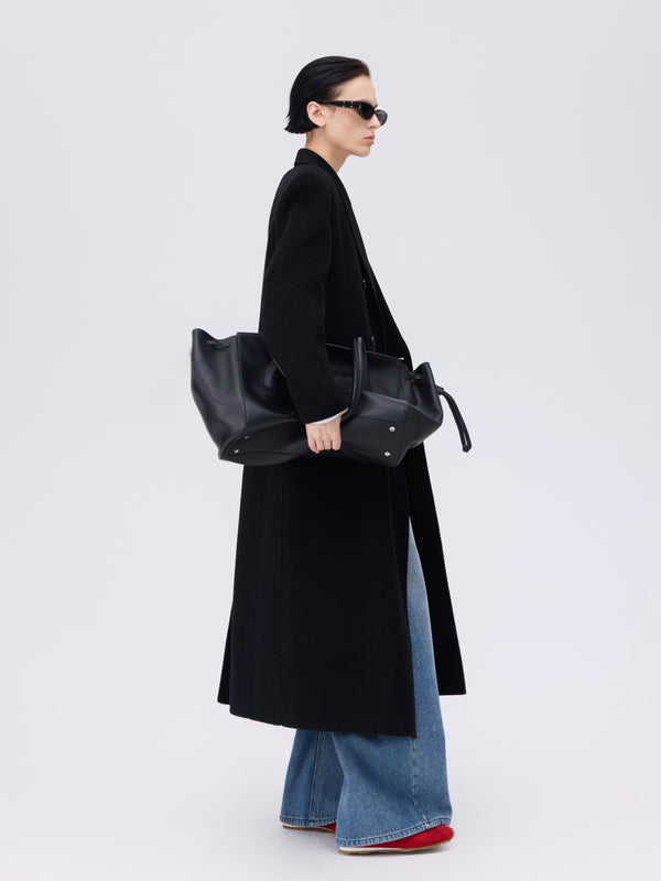 Tailored wool–mohair coat in a longline double-breasted silhouette.