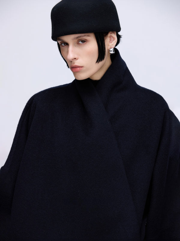 Asymmetric wool coat with draped collar and relaxed silhouette.