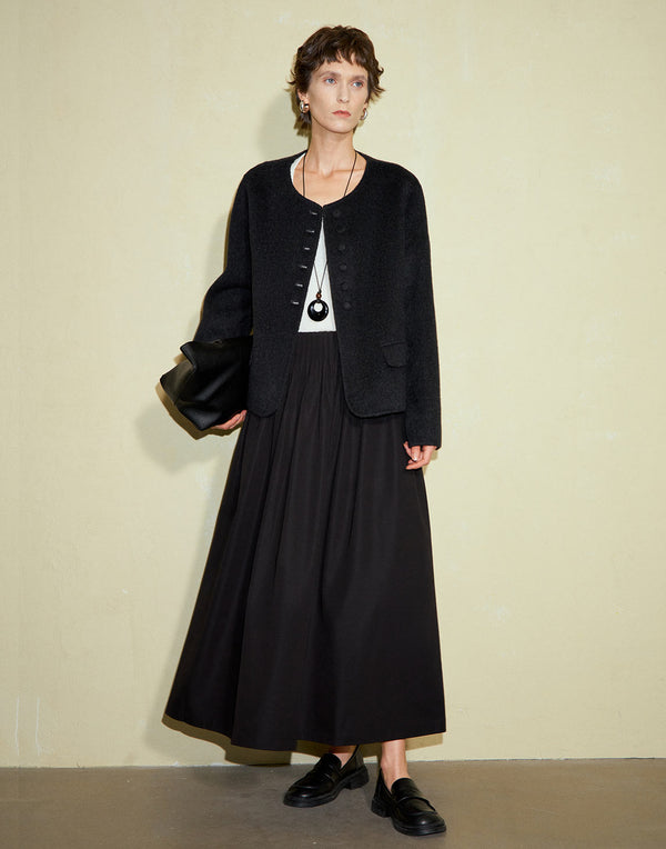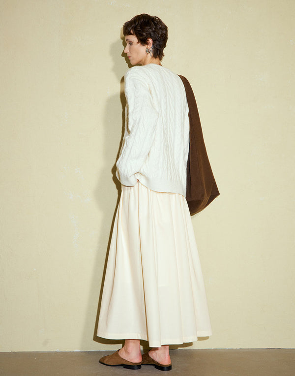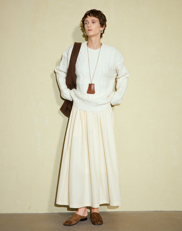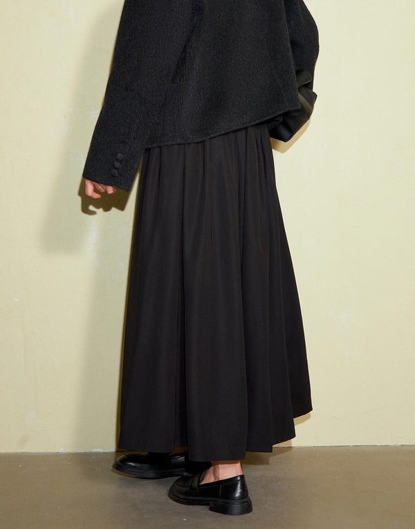Wool-blend pleated A-line skirt—polished mid-calf style with timeless ease.