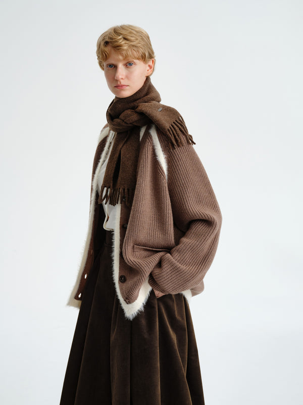 Contrast-trim cardigan with fox-fur texture and wool blend knit.