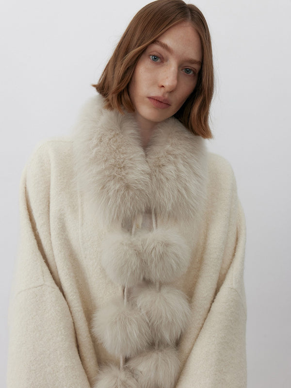 A plush fox-fur scarf finished with playful pom ties—soft volume, clean drape, and an easy wrap that elevates simple winter layers.