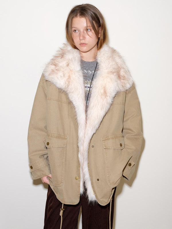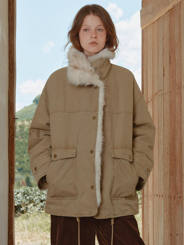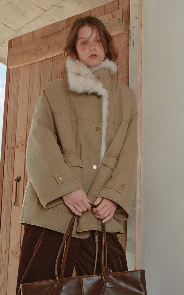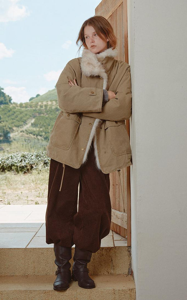 A washed-canvas down parka with a dyed-tip collar—utility, softened and winter-ready.
