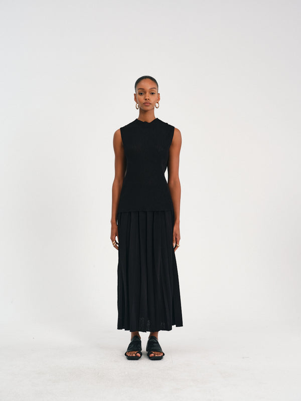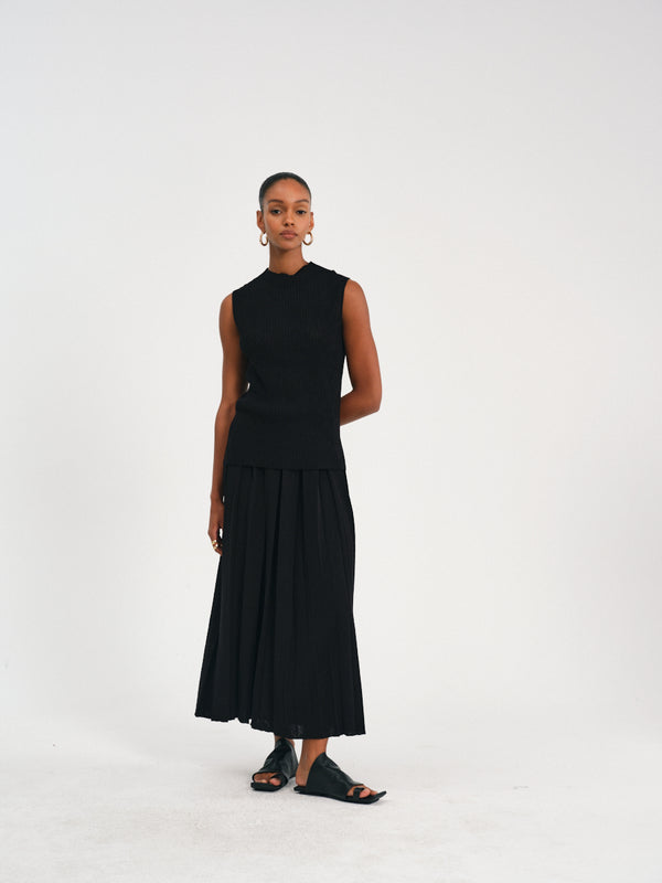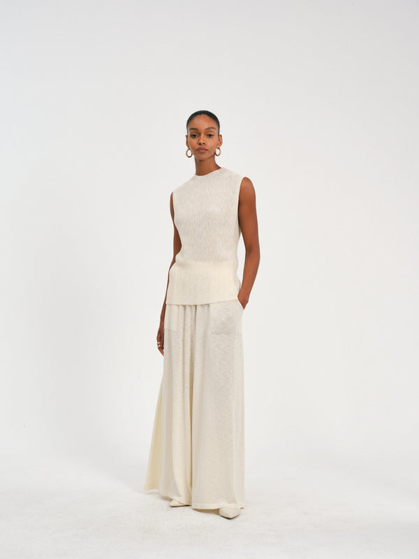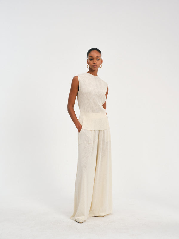 Pleated knit tank top with a round neckline and sleeveless design, crafted from a breathable cotton-linen blend