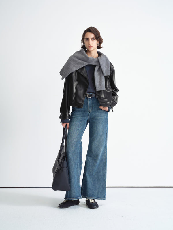 Boxy cropped jacket in protein leather with two-way collar—structured, versatile, and sleek for modern styling.