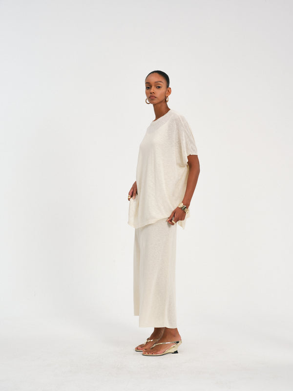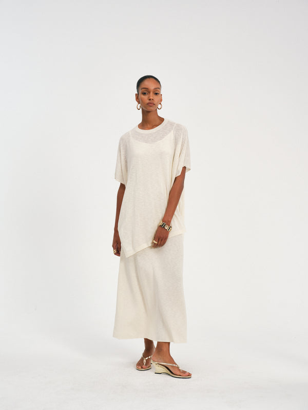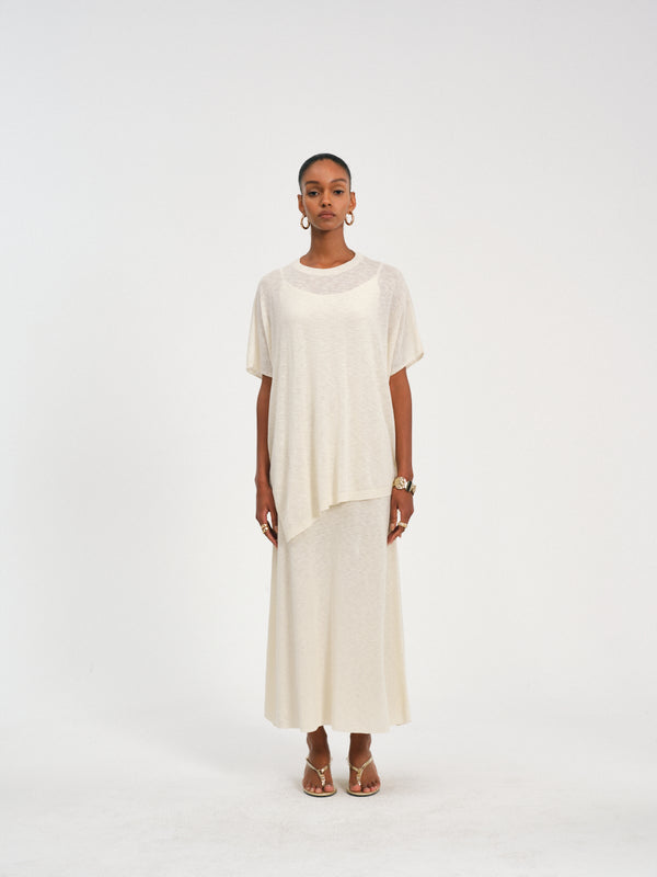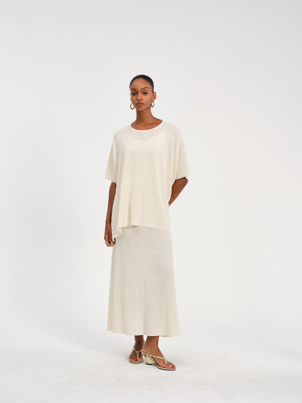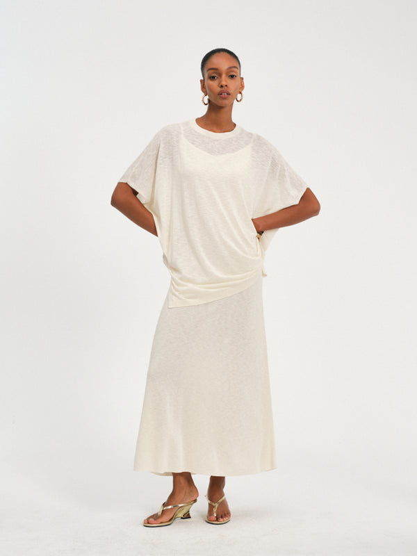 Batwing sleeve top with an asymmetrical hem, crafted from a breathable cotton-linen blend for relaxed elegance.