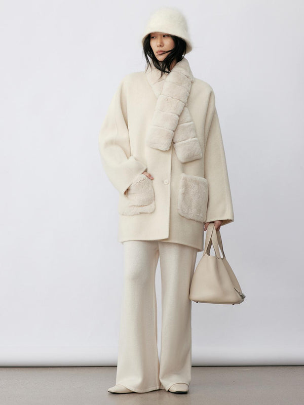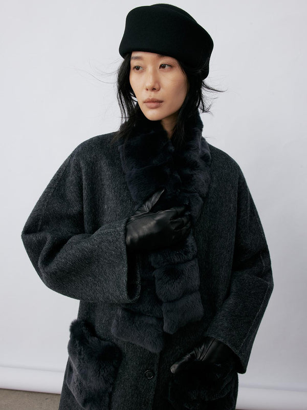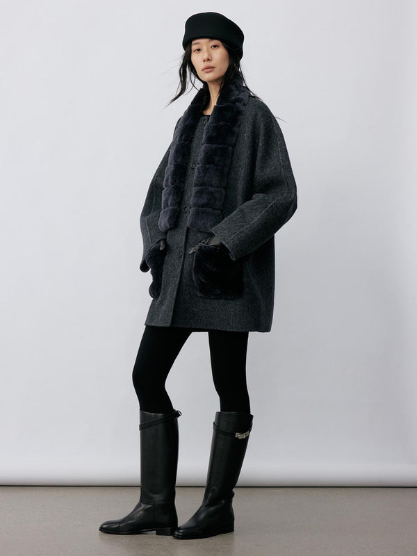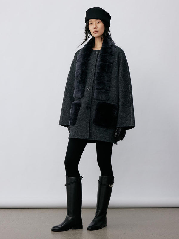 Composition: Shell 80% Wool, 10% Rabbit Hair, 10% Silk; Pocket Trim 100% Rex Rabbit Fur; Lining 95% Polyester, 5% Spandex.