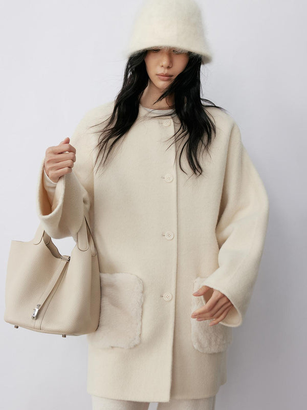 A clean double-faced coat with plush fur pockets for quiet contrast.