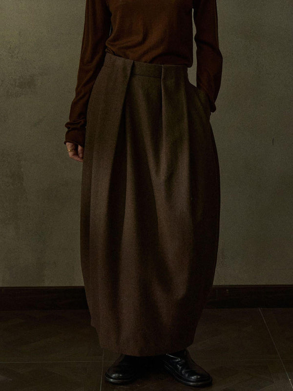 Wool-blend cocoon skirt with structured pleats and sculptural drape.