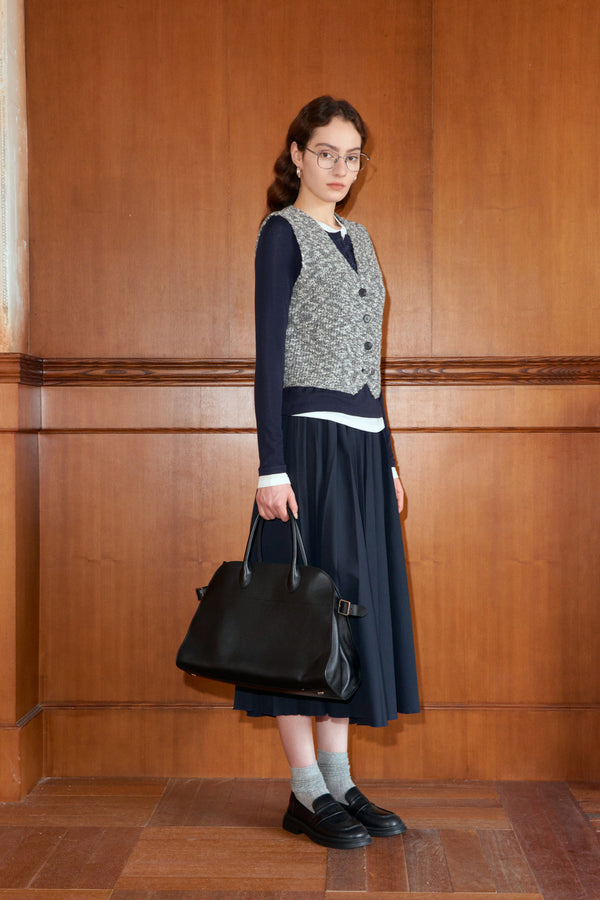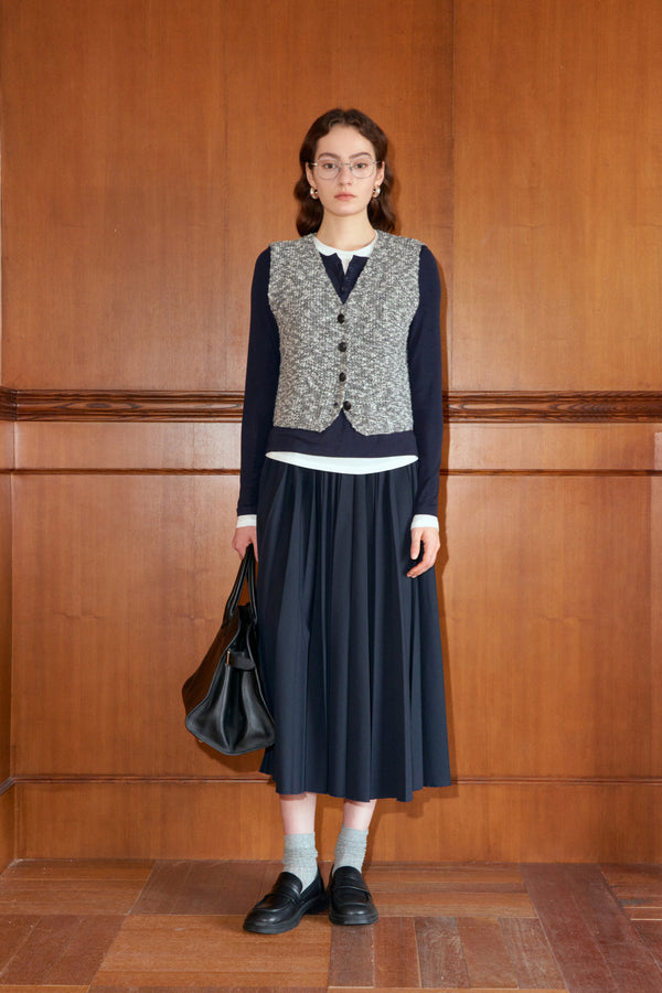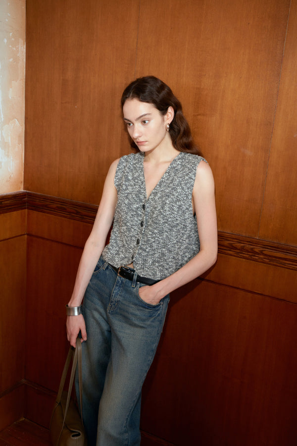 Cropped knit vest in black-white tweed blend with V-neck—lightweight, warm, and easy to layer.