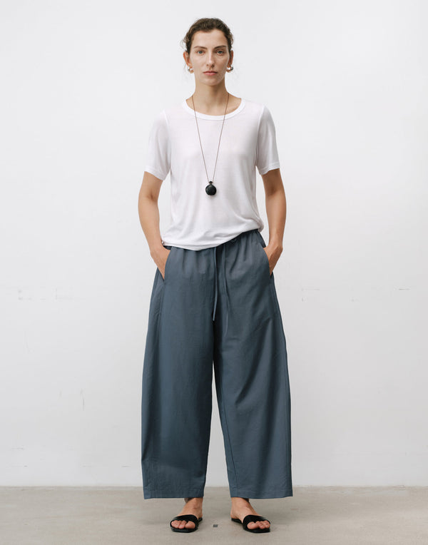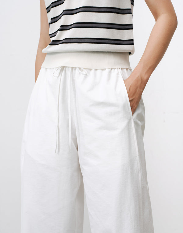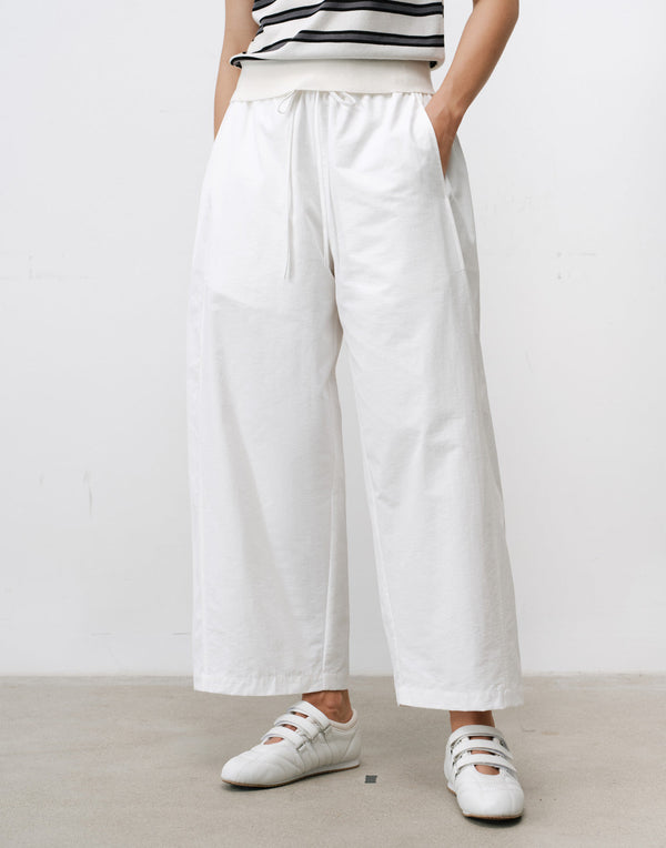 High-rise balloon pants with drawstring waist and easy cotton-nylon blend.