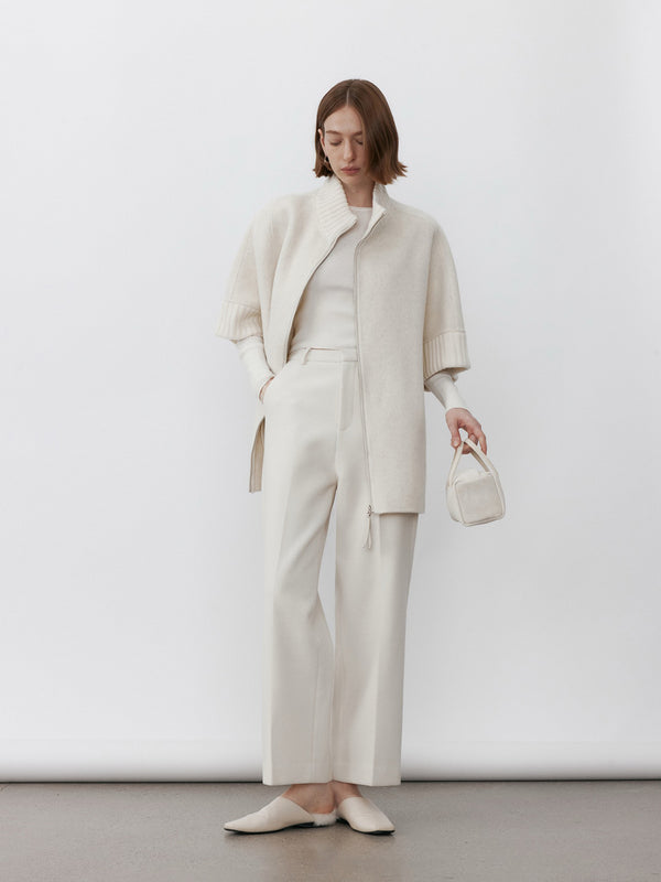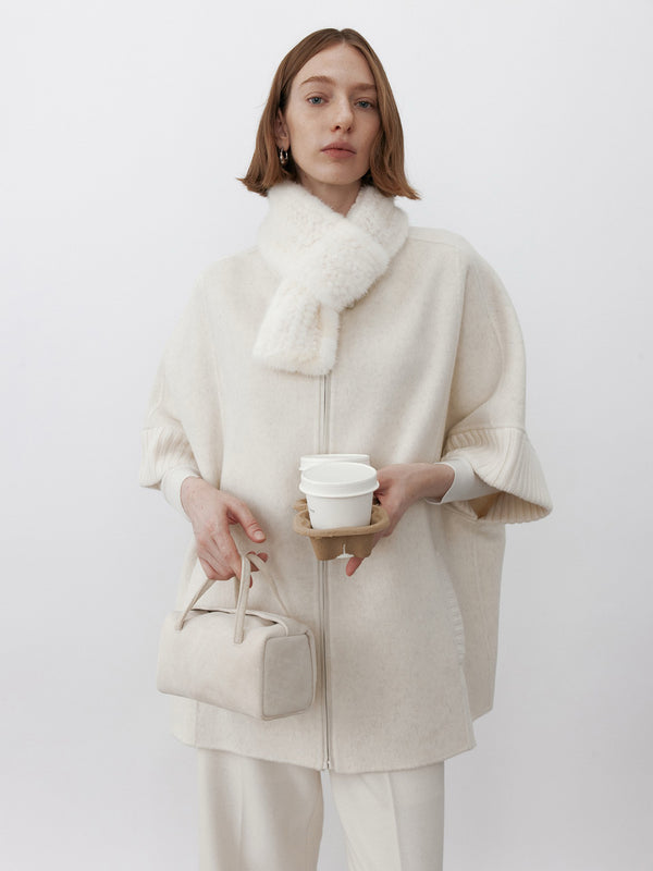 A zip-front cape jacket in a wool–silk–camel blend—softly structured, warm, and cleanly modern.