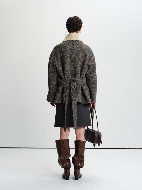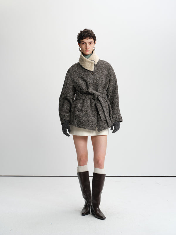 Insulated wool-tweed coat with a detachable plush collar and tie belt for structured winter warmth.