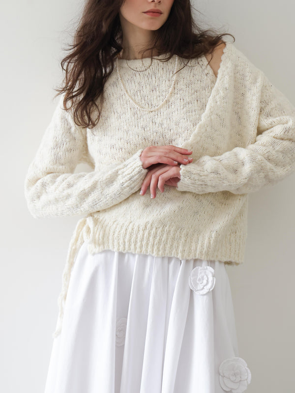 A quietly directional faux-two-piece knit—soft wool-blend texture with an asymmetric wrap and tie for effortless shape.