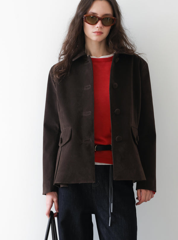 A softly structured button jacket with a clean collar and sculpted flap pockets—minimal, polished, and easy to pair.