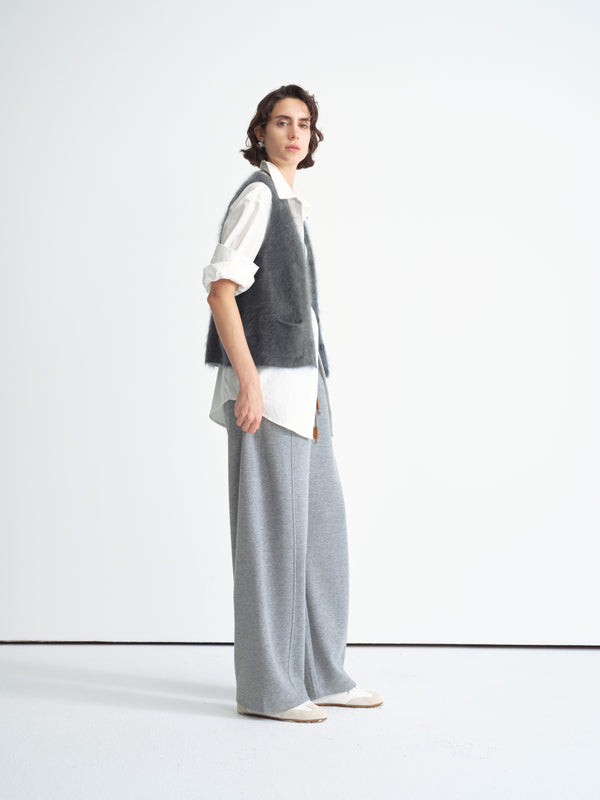 Relaxed scythe-cut wide-leg pants with drawstring waist—structured yet soft, versatile for casual and urban looks.