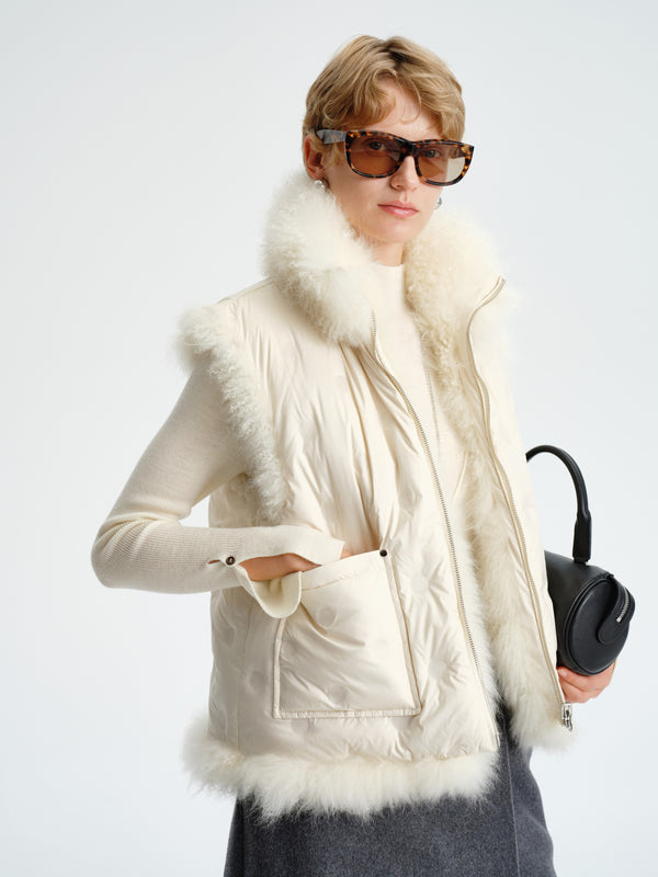Reversible down vest crafted from cashmere goat fur and nylon.