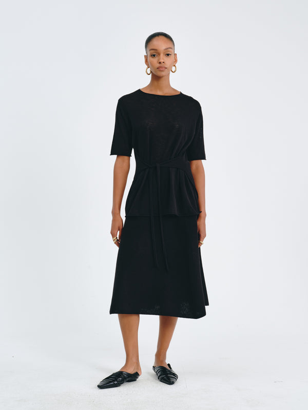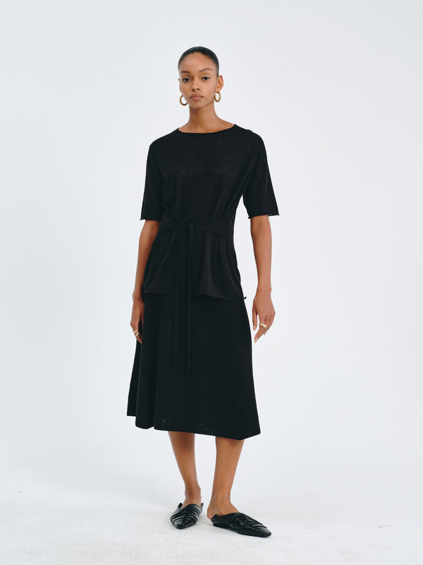 Cotton-linen A-line skirt with a flowing hem and elastic waistband for a relaxed, flattering silhouette.