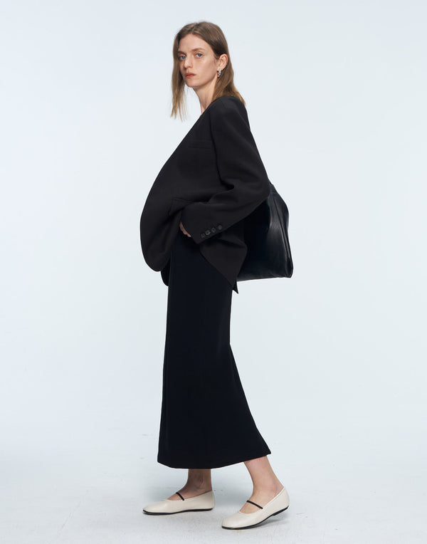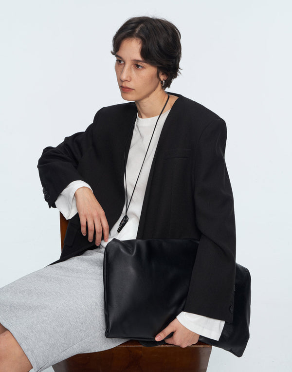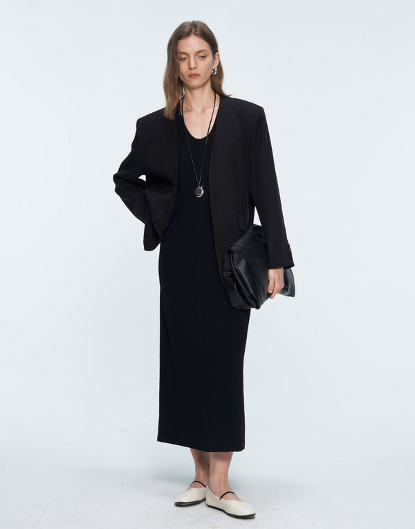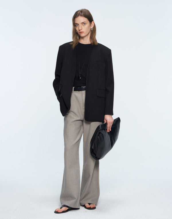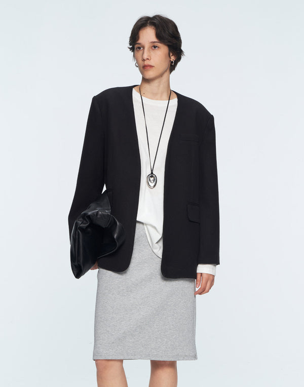 Minimalist structure—this collarless twill blazer offers sleek polish with effortless ease.