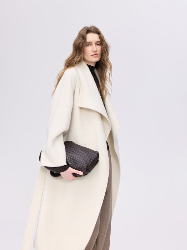 Asymmetric wrap wool coat with oversized lapels and tie belt.
