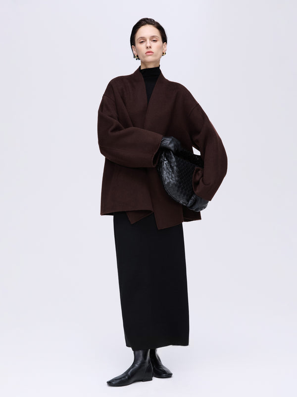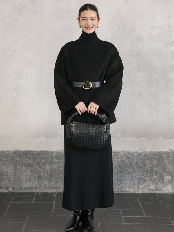 High-neck wool–camel coat with sculpted silhouette and belt.