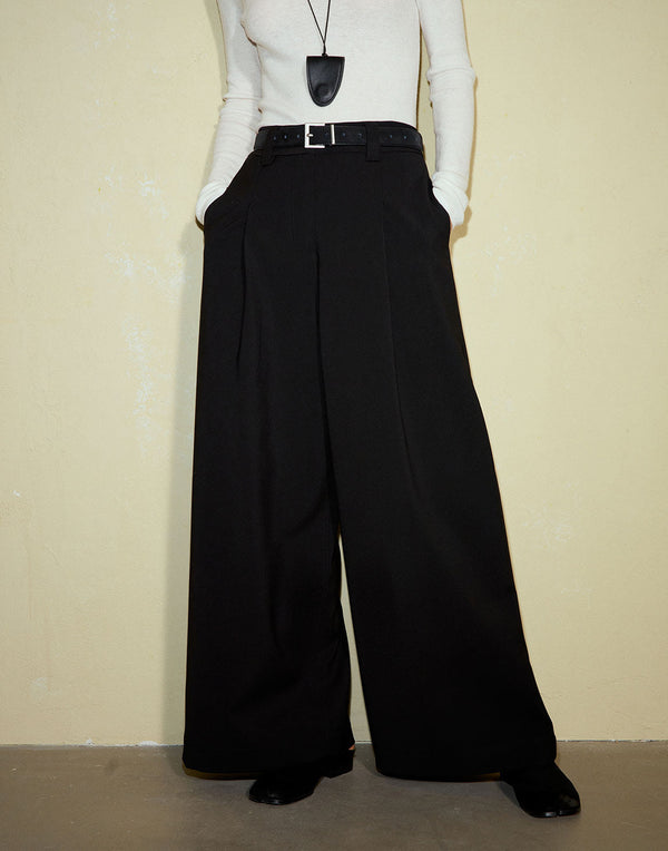 Wide-leg trousers with fluid pleats and a sleek flat waistband.
